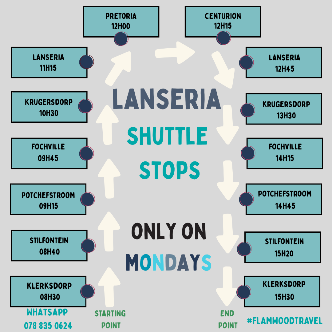 Please note that bookings will only take place after being confirmed through us as well as all payment being made. EFT banking details are available below. Payment must be made to confirm booking of shuttle.